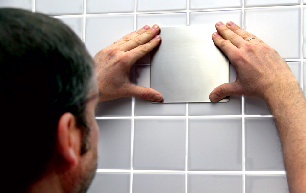 Você já sabia que Mobeli pode também ajudá-lo quando seus azulejos são menores de 14 cm ou se eles não têm uma superfície lisa? Duas chapas de aço inoxidável autocolantes Mobeli, simplesmente estas poderão ser coladas onde você gostaria de posicionar sua Barra Mobeli inclusive em superfícies de madeira, a única condição é que a superfície esteja firme o suficiente. Sem perfuração - sem parafusos. As placas poderão ser desmontadas quando elas não forem mais necessárias, poderão ser retiradas sem nenhum dano ao azulejo e sem deixar resíduos do adesivo.